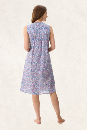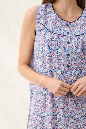 Daisy sleeveless short nightie features a vibrant deep blue-based floral print—perfect for the summer season. The curved front yoke is trimmed with a striking deep blue satin piping which also edges the neckline. Self fabric binding edges around the armhole and there is a front button placket. The skirt of the nightie is gathered onto the front and back yokes allowing for extra comfort. Add the matching Daisy brunchcoat to create a fresh, crisp summer set.