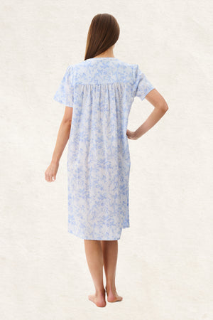 The Eliza print short sleeve short nightie features a fresh floral print in blue and white tones, perfect for warmer nights. It is styled with a round neckline trimmed in white lace, adding a soft, elegant touch with softly gathered sleeves. An angled straight front yoke with narrow pleats and a front button placket adds subtle detail, while gentle gathers from the yoke allow the skirt to fall with ease and flow.