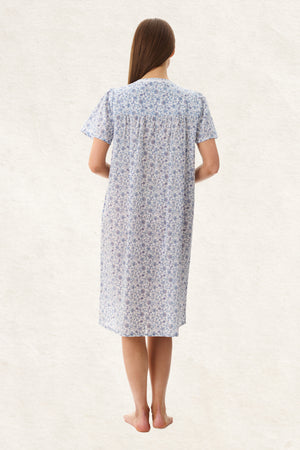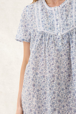 Astrid is a contemporary detailed paisley print in inky blue tones in 100% woven cotton which is a light and cool choice for summer. The short sleeve short nightie is detailed with white lace trim edging the neckline, front button placket and bodice, soft gathers fall from the front bodice. The back skirt of the nightie is slightly gathered into the back yoke giving a lovely drape.
