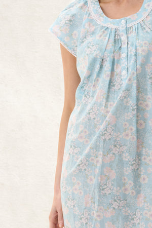 Soft, elegant, and effortlessly feminine, this Cora cap sleeve short nightie features a beautiful printed floral design in a refreshing mint hue. Cora print cap sleeve nightie is designed for comfort and ease. Featuring a soft round neckline with gentle gathers at the front and sleeves and a front button placket opening, this nightie offers a relaxed, feminine silhouette. The raglan cap sleeves are finished with a delicate lace trim at the edge, adding a soft and graceful detail.