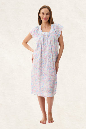 The Faye printed cap sleeve short nightie is a perfect blend of comfort and style, featuring a summery, multi-coloured print that brings a fresh and vibrant feel to your sleepwear collection. Faye print cap sleeve nightie is designed for comfort and ease. Featuring a soft round neckline with gentle gathers at the front and sleeves and a front button placket opening, this nightie offers a relaxed, feminine silhouette. The raglan cap sleeves are finished with a delicate lace trim at the edge, adding a soft and graceful detail.