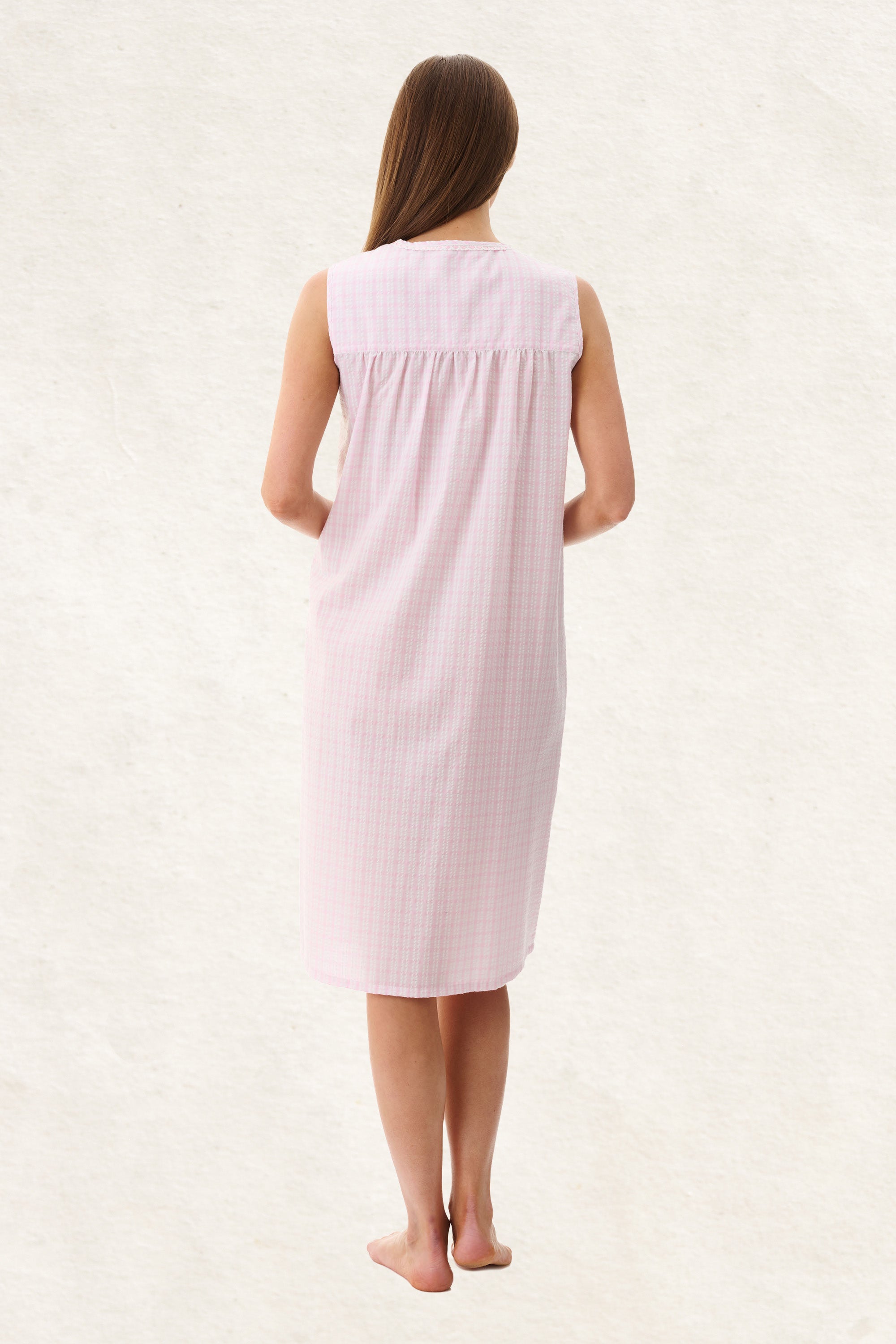 Our classic pink and white seersucker check sleeveless short nightie is an easy care garment made in polyester cotton woven seersucker and perfect for summer. It features a sweet round neckline with lace detailing and a front button placket with pintucks on either side for a soft, refined look. The curved front yoke is trimmed with self piping. The skirt of the nightie is gathered onto the front and back yokes allowing for extra comfort and falls just below the knee. Add the matching brunchcoat to create a fresh, crisp summer set.
