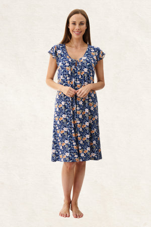 Sleep in grace, wake up in style. Introducing Sandra, where comfort meets chic in our flutter sleeve short nightie, adorned with a stunning floral print. Features keyhole front opening and centre front pleats for ease of wear. Crafted from luxurious slinky knit fabric.