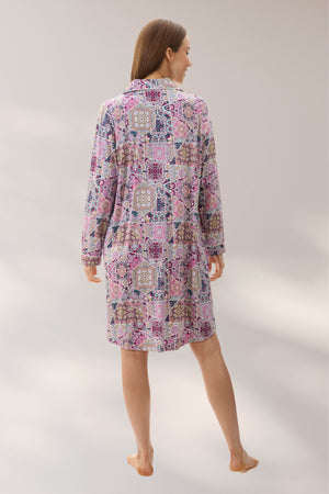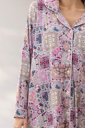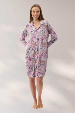 Short length sleepshirt in the lovely abstract Kayla multi print. Long sleeves with full button opening, collar, cuffs, and shaped hemline. This beautiful soft knit pyjama has contrast ivory satin piping accents. Cotton Bamboo is soft, cool and comfortable to wear.