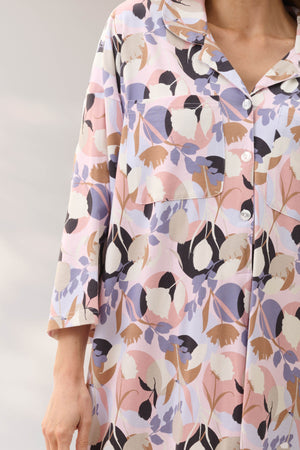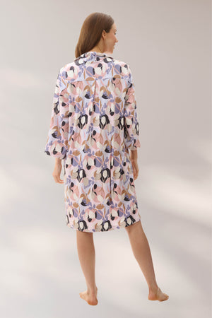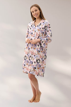 Short length sleepshirt with 7/8th length sleeve in Greta print. This striking pastel sleepshirt has a relaxed fit with collar, front button placket and side splits at hem. Oversized patch pocket styling on both sides of front chest. Cotton Bamboo is soft, cool and comfortable to wear.