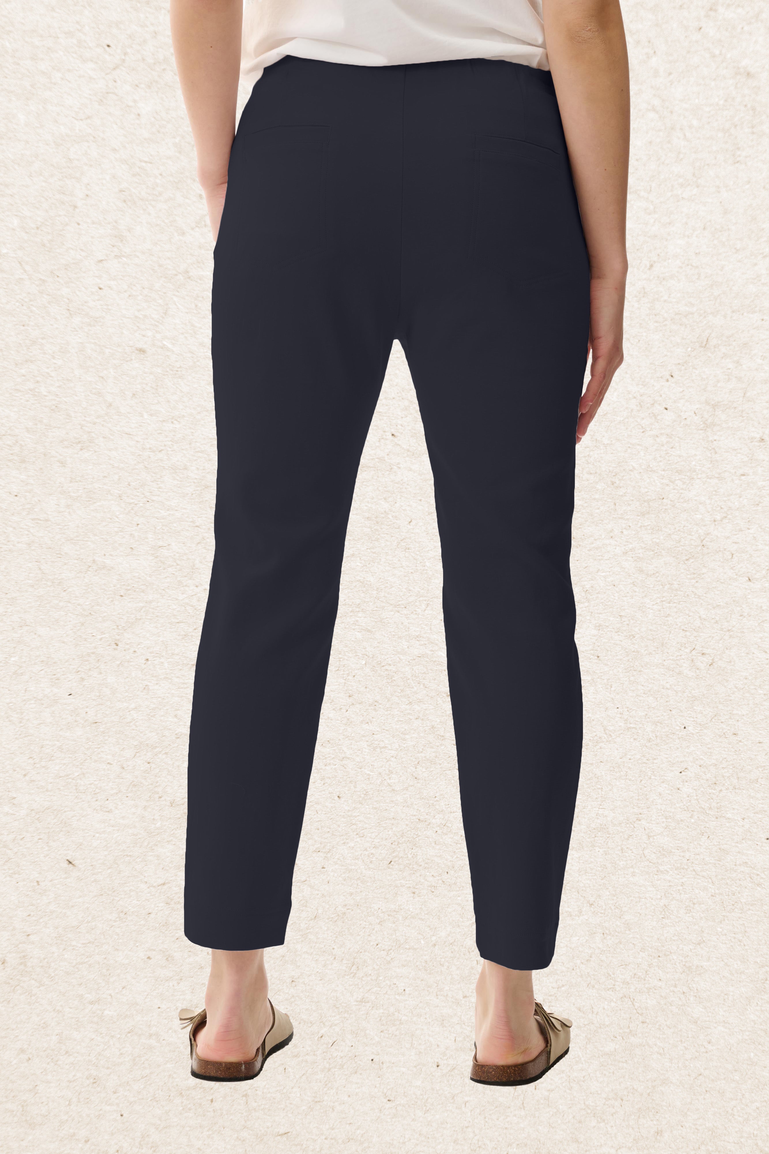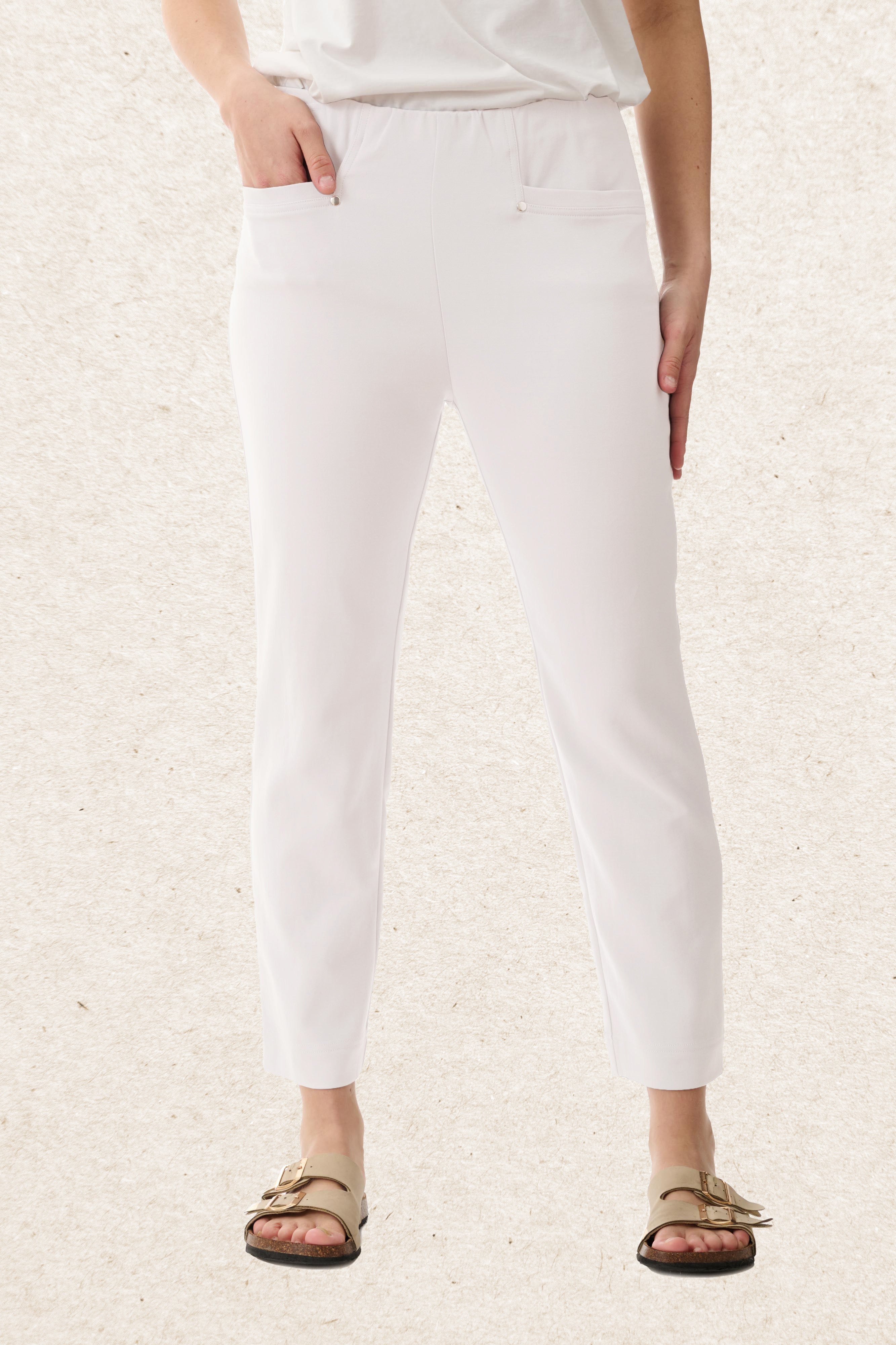 These essential cropped pants are made from a comfortable stretch blend of 50% cotton, 46% viscose, and 4% elastane for a flexible, breathable fit. With a pull-on style, elasticated waist, front pockets, and subtle hem splits, they’re a go-to choice for effortless, everyday dressing.