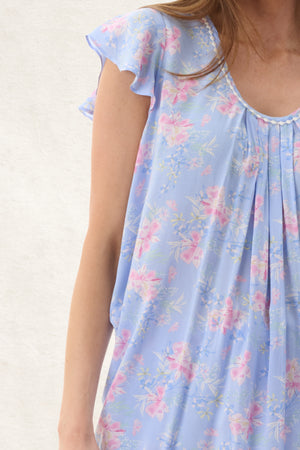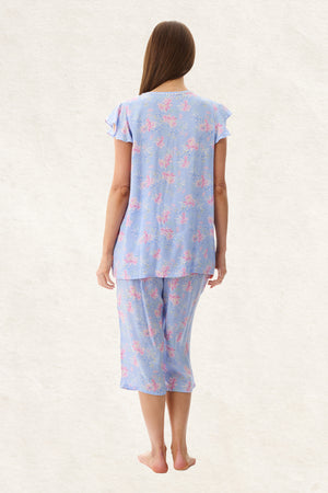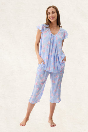 Embrace the elegance with our Jessica floral print flutter capri pyjama. Crafted from 100% woven viscose, the pyjama top features a flutter sleeve, pleated front neckline to provide comfort and sweet bobble trim under the self binding. The capri pant has an elasticated waist and self fabric waist tie. Light soft and cool, the capri pyjama set is perfect to wear on warm summer nights.