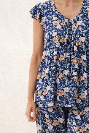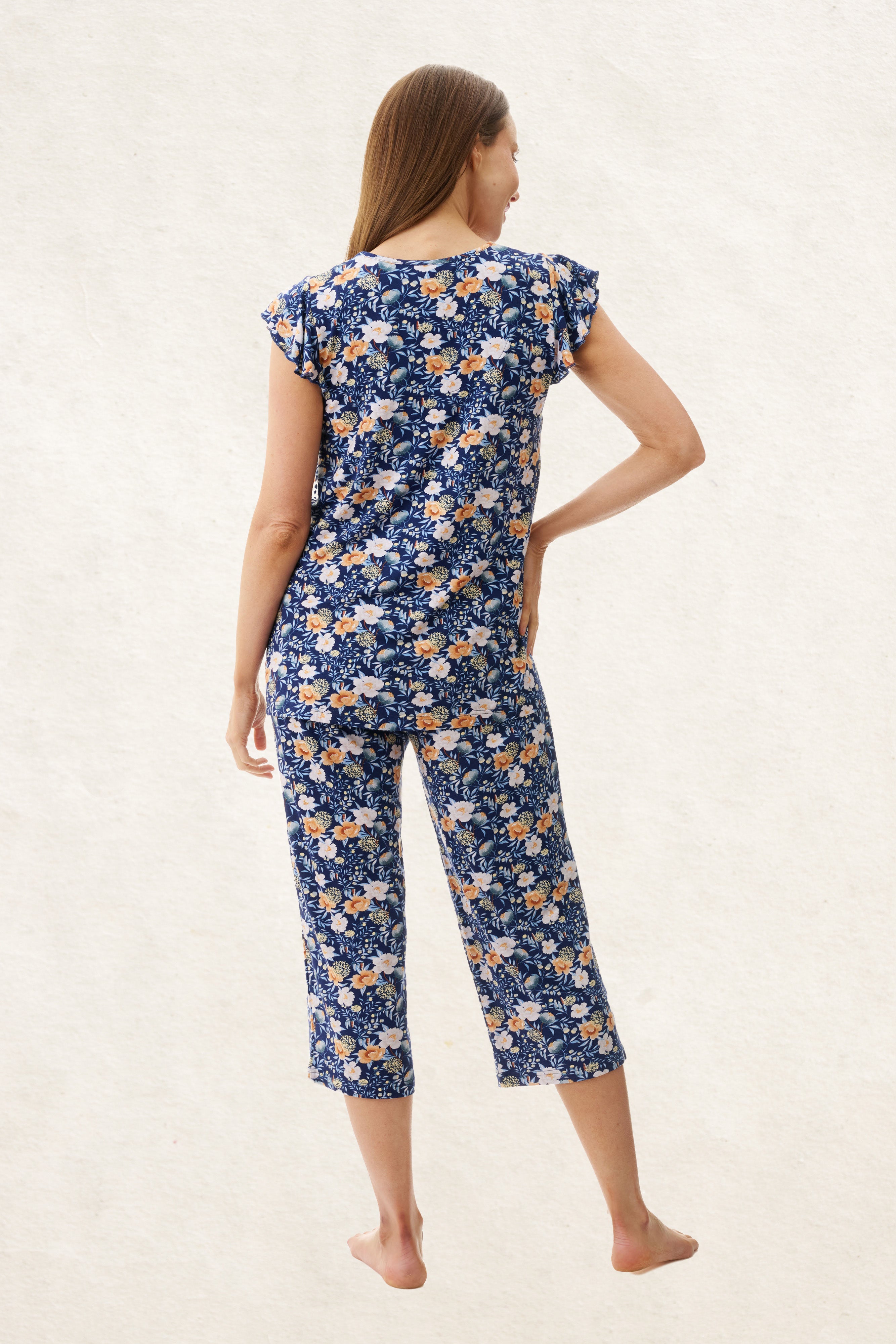 Sleep in grace, wake up in style. Introducing Sandra, where comfort meets chic in our flutter sleeve capri pyjama set, adorned with a stunning floral print. Features keyhole front opening and centre front pleats for ease of wear. Crafted from luxurious slinky knit fabric.