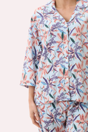 Pyjama with 7/8th length sleeves in our modern "Rylie" leaf print. This striking aqua pyjama has a relaxed fit with dropped shoulder and dropped back hemline with side splits. Pants have an elastic waist, side pockets and a waist tie. Favourites for sleeping and lounging. Cotton Bamboo is soft, cool and comfortable to wear.