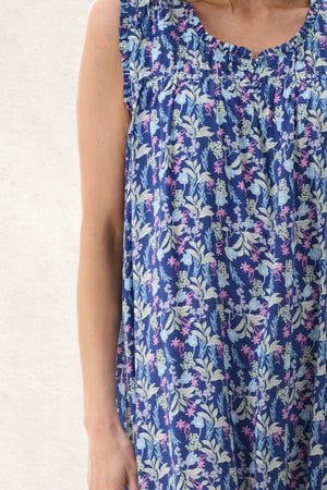 Introducing the 'Maria' Sleepwear Collection, where playful florals dance on a navy canvas. This sleeveless short nightie is crafted from 100% woven viscose. This nightie features elastic shirred detail on the front and back, a self frill around the round neck edge and armholes. The front offers a keyhole opening with 2 buttons. Light soft and cool, this floral print nightie is perfect to wear on warm summer nights. Wear with the Maria brunchcoat to complete your look