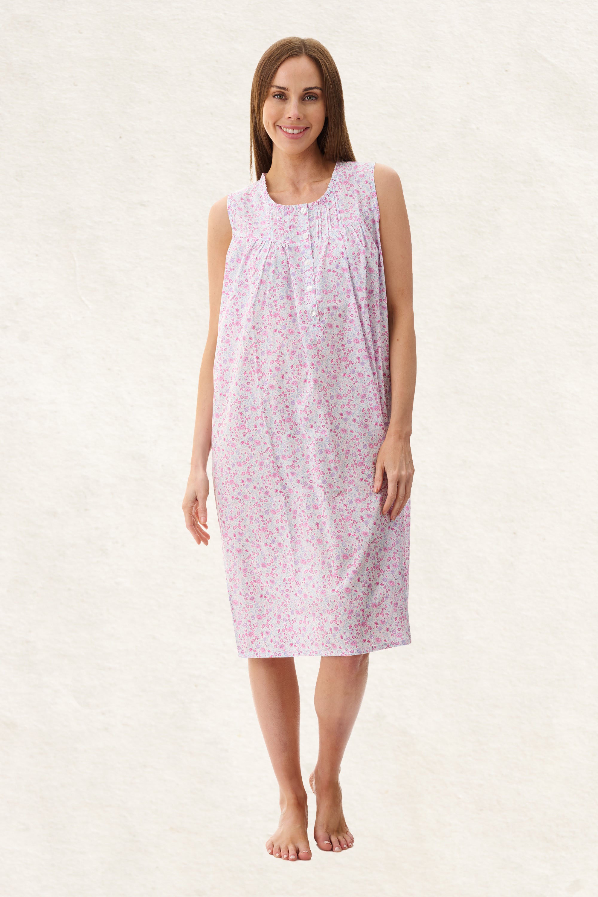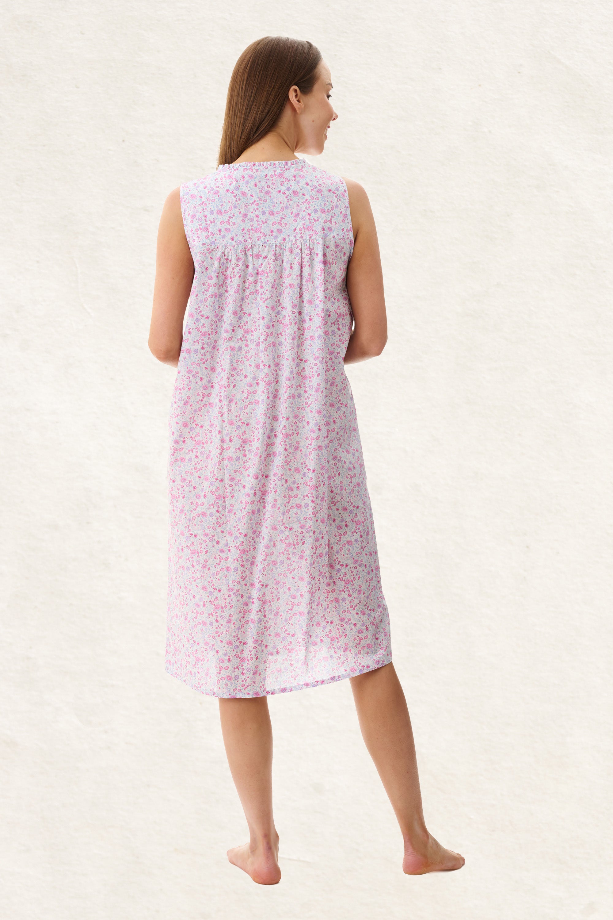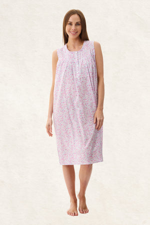 The Brodie printed sleeveless short nightie is a perfect blend of comfort and style, featuring a summery, multi-coloured print that brings a fresh and vibrant feel to your sleepwear collection. This knee-length nightie is designed with a narrow self-gathered frill at the neckline and self fabric binding around armholes adding a subtle touch of elegance. Detailed with a 5-button placket opening, front yoke with small pintucks on either side, creating a refined and feminine look. The softly gathered skirt flows gently from the yoke, offering ease and comfort throughout the night. For a complete look, layer with the Brodie printed bruchcoat, the ideal complement to this beautiful nightie.