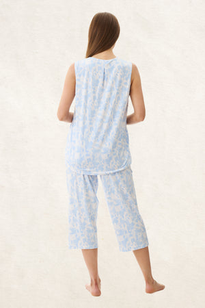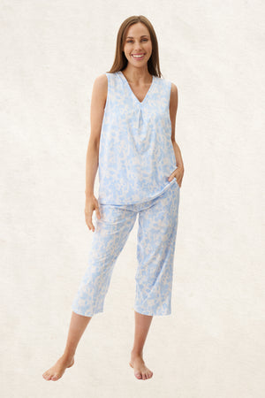 Embrace the charm of our Ginger sleeveless capri pyjama featuring a V Neck top with inverted pleat at the front and binding around the armholes. The capri length pyjama pants include side pockets, soft elasticated waist and self fabric tie. This delightful set boasts a playful abstract blue print crafted from a blend of 50% Cotton, 45% Bamboo, and 5% Elastane. It promises a soft, breathable, and stretchy embrace for your most comfortable nights' sleep.