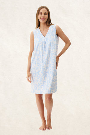 Embrace the charm of our Ginger sleeveless short nightie featuring a V Neck with inverted pleat at the front and binding around the armholes. This delightful nightie boasts a playful abstract blue print crafted from a blend of 50% Cotton, 45% Bamboo, and 5% Elastane. It promises a soft, breathable, and stretchy embrace for your most comfortable nights' sleep.