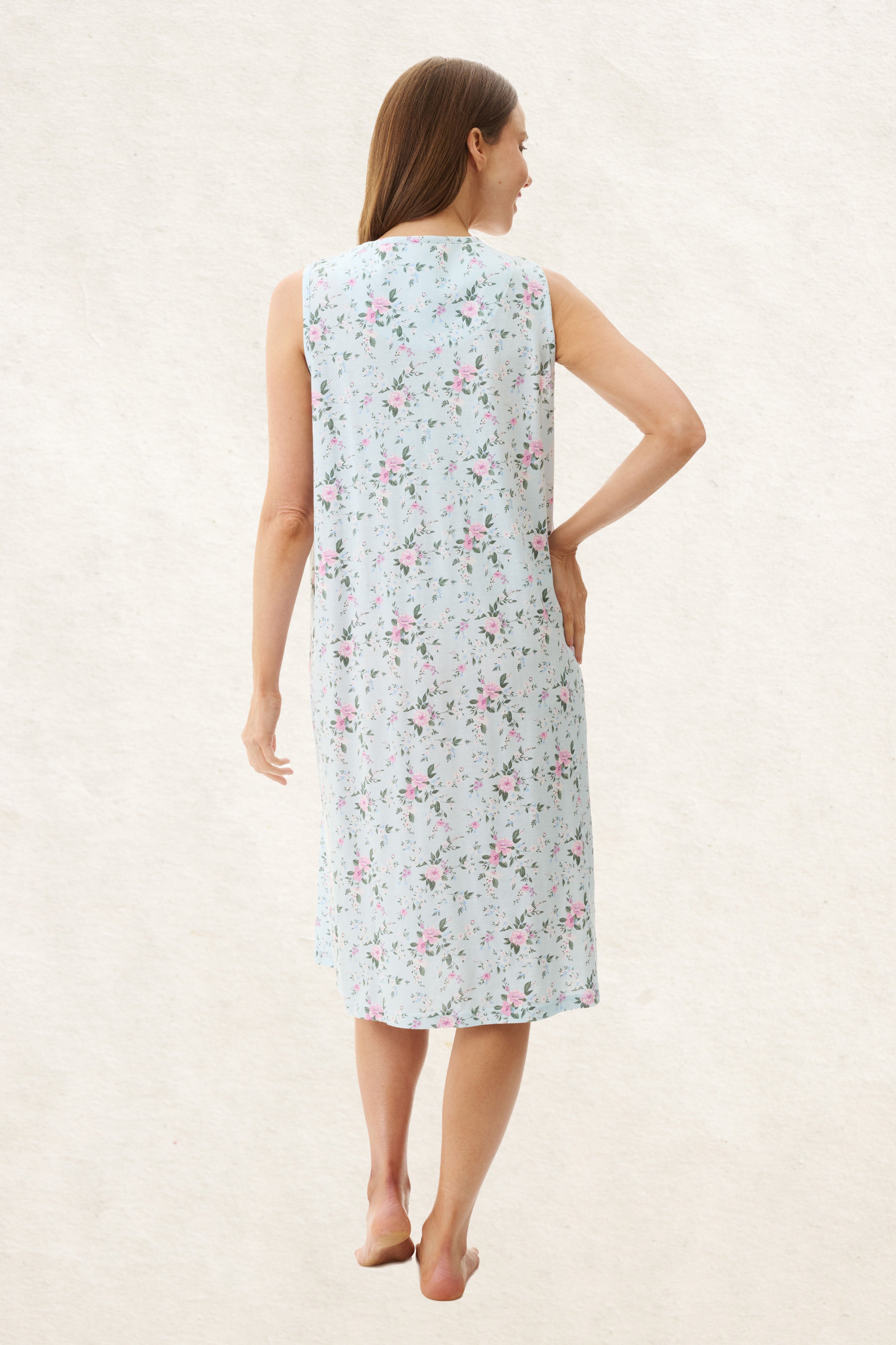 Light and pretty mint floral print on 100% cotton knit jersey. Sleeveless short length nightie with criss cross pintuck feature at front with soft gathers. Round neckline and armholes with self binding and front button placket.
