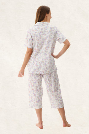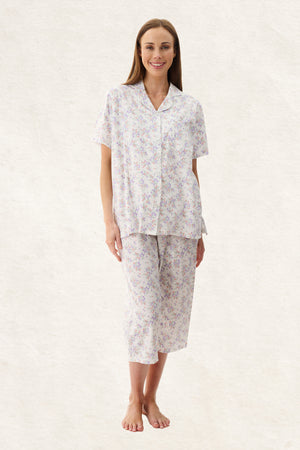 Capri length pyjamas in Uri summer floral print knit jersey.  Short sleeve top with classic collar and front button opening with self piping. Chest pocket and side splits. Pants are capri length with a drawstring, and comfortable elastic waist.