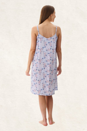 Stunning abstract floral print on beautiful 100% cotton knit jersey.  This short length nightie is a lovely choice for hot summer nights. This nightie has adjustable straps,  a vee neck with ladder lace detail. 3 pleats at the centre front  providing a feminine soft look, and comfort of movement.