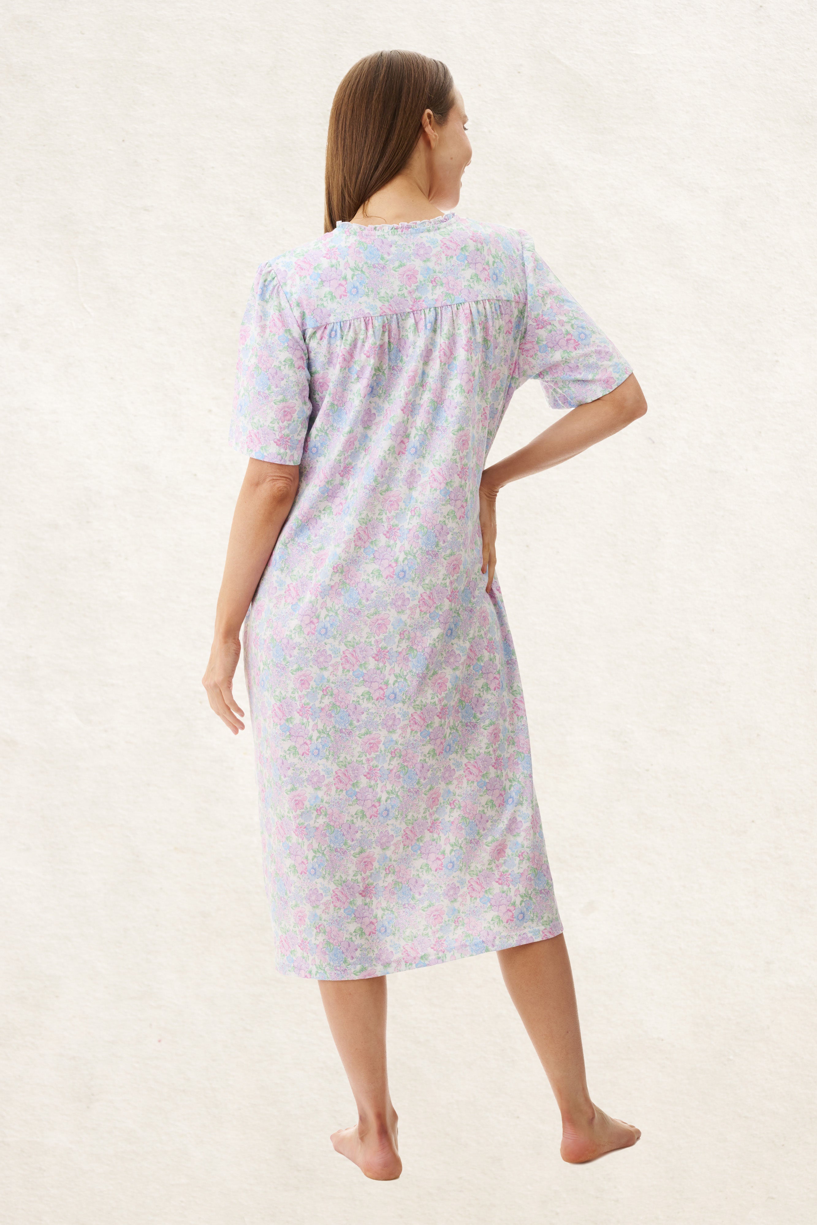 Summery floral print on beautiful 100% cotton knit jersey. This brunchcoat is a lovely choice on its own or worn over one of our Uma print nighties. The Brunchcoat has short sleeves, and a narrow frill around the neckline. Front and back yoke with soft gathers to the skirt. The front yoke has pintucks, and a narrow lace trim. There is a full front button opening.