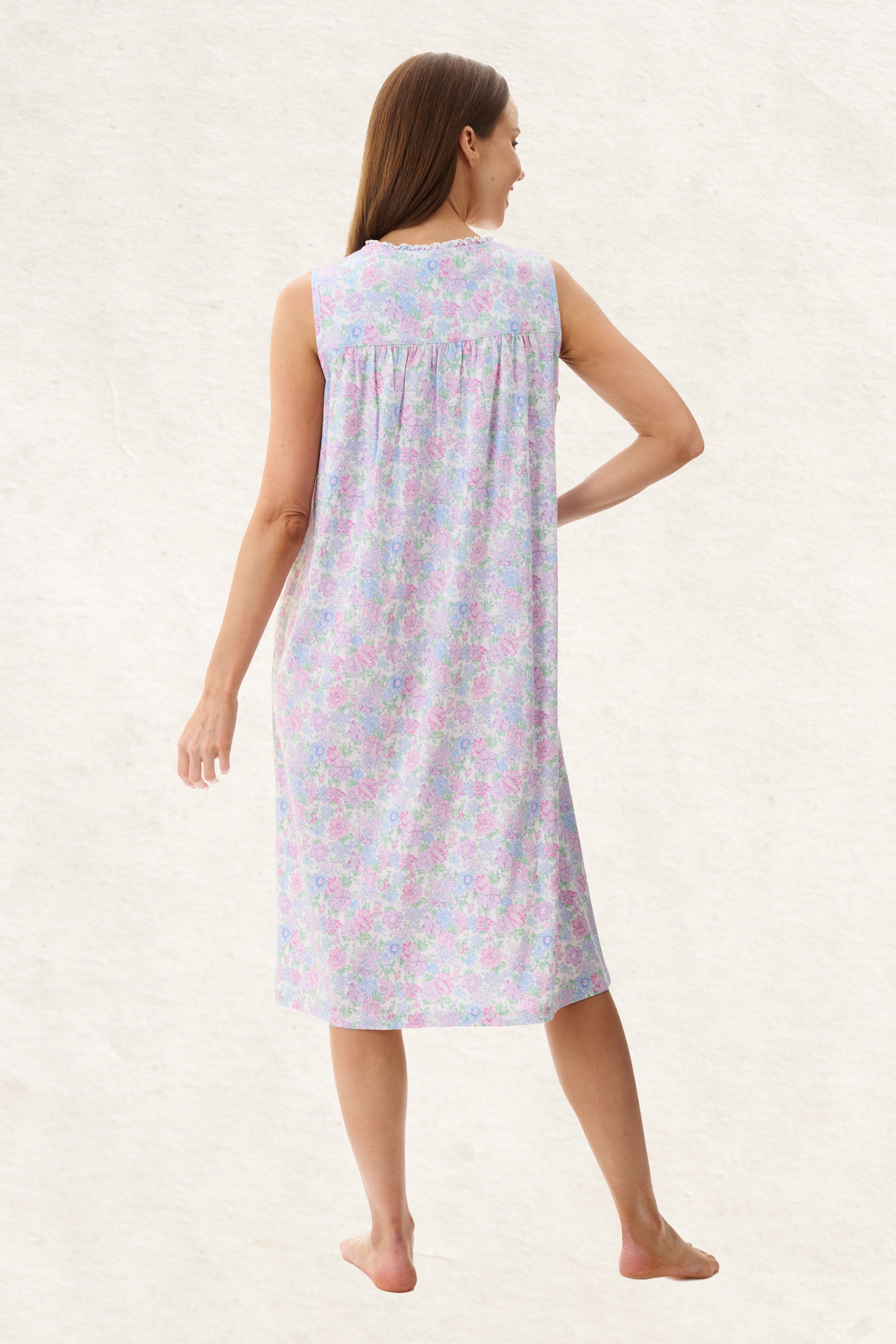 Summery floral print on beautiful 100% cotton knit jersey. This short nightie is a lovely choice for hot summer nights. This is a sleeveless short nightie with a narrow frill around the neckline. The nightie has a front and back yoke with soft gathers to the skirt. The front yoke has pintucks, and a narrow lace trim. There is a front button opening.