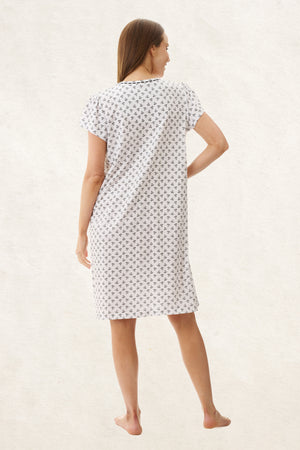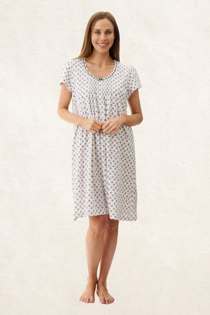 Dani striking black and white print on beautiful 100% cotton knit jersey. This short sleeve short nightie is a popular choice for warm summer nights. Dani nightie has a lovely round neck with pintucks at the centre front and sleeve head providing a feminine soft look, and comfort of movement. The neckline has a stunning lace trim with black ribbon threaded through and a sweet bow accent at centre front.