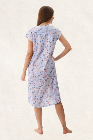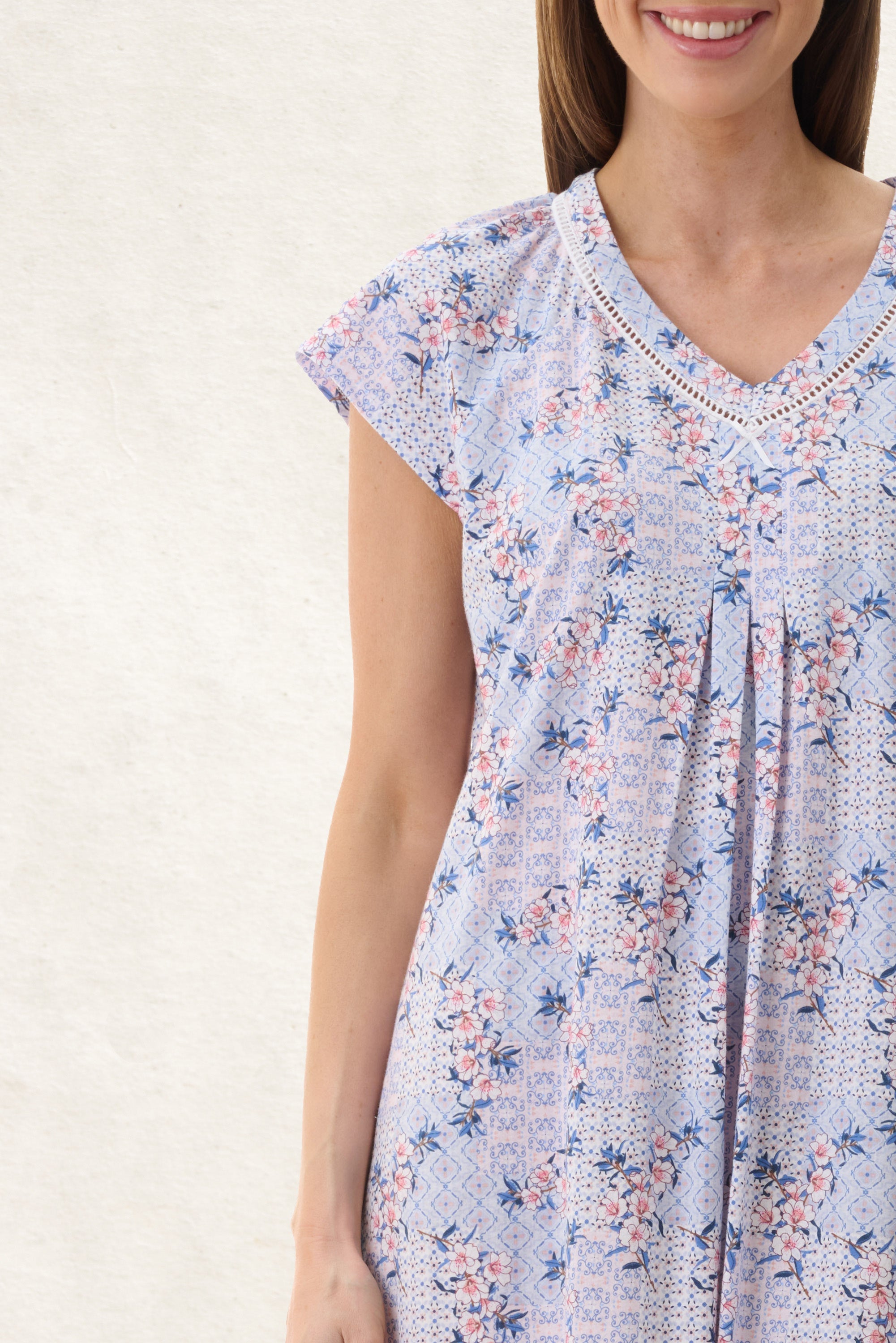 Stunning abstract floral print on beautiful 100% cotton knit jersey. This short length nightie is a lovely choice for hot summer nights. This nightie has a raglan cap sleeve, a vee neck with ladder lace detail. 3 pleats at the centre front providing a feminine soft look, and comfort of movement.
