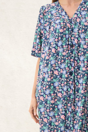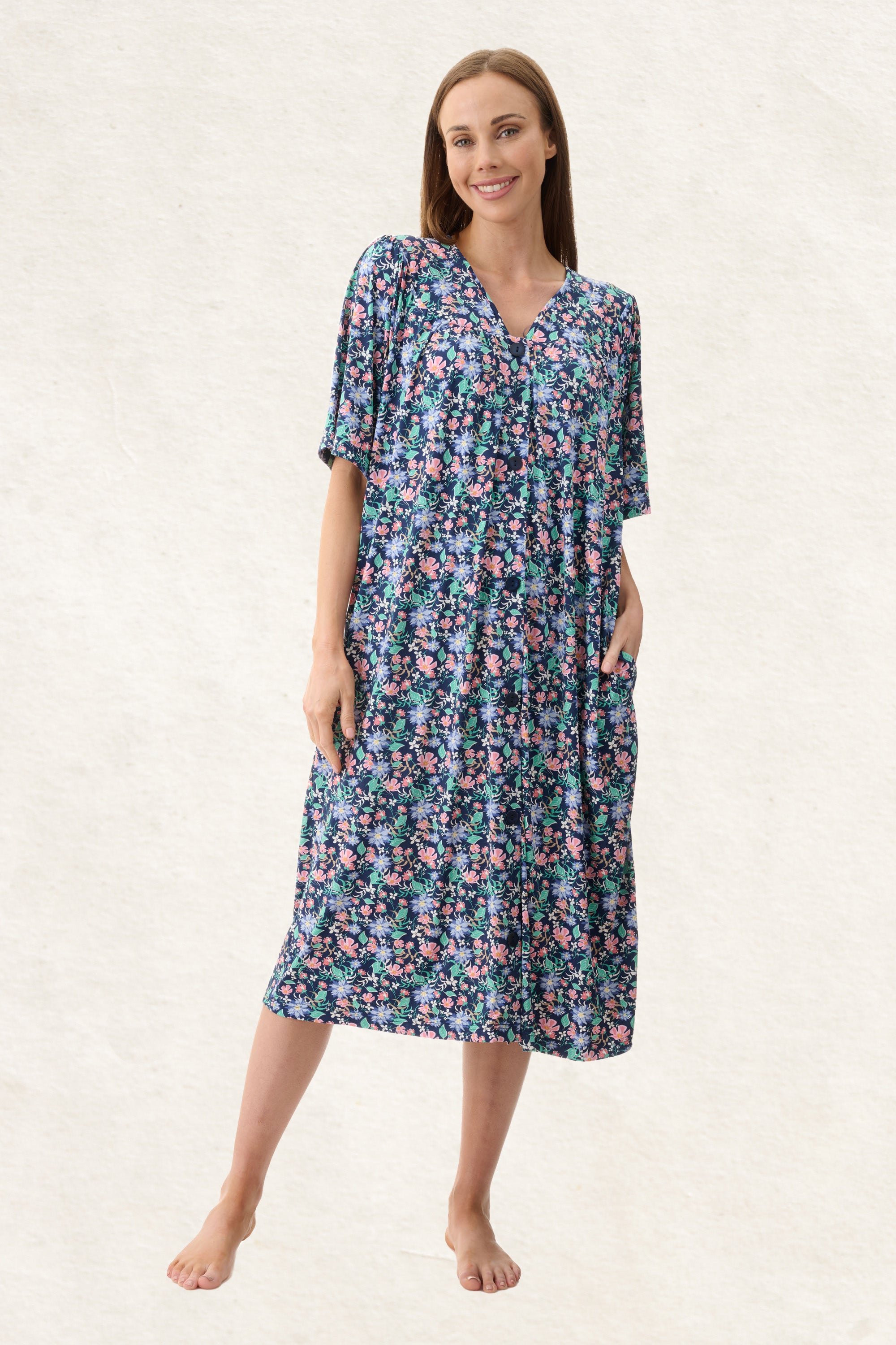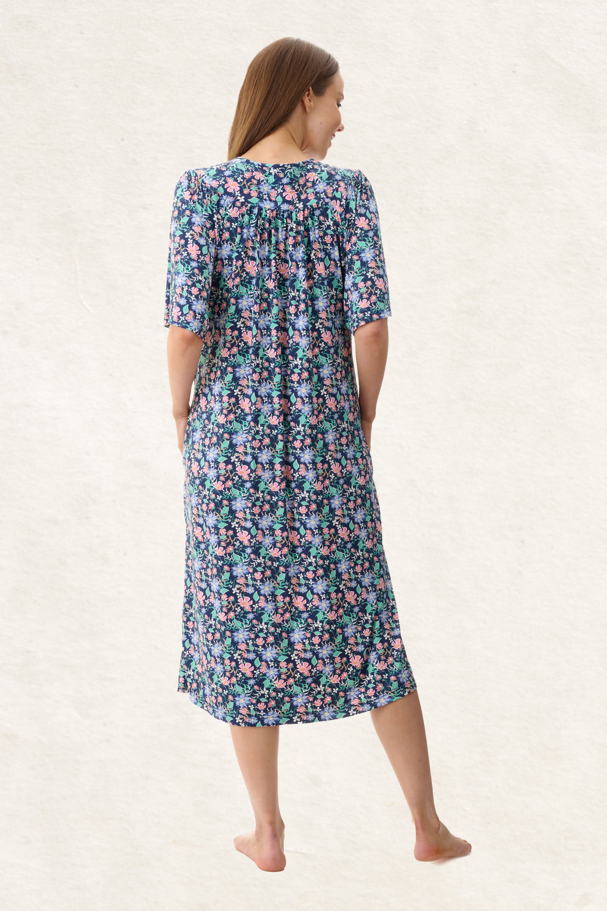 Short sleeve, button through, short brunchcoat with a curved quilted yoke, the quilting extends over the shoulder and across the back yoke of the brunchcoat. Front and back gathers fall from both yokes. This fresh royal floral slinky knit fabric has a silky finish enhancing the comfort and ease of movement. Wear by itself, or with one of our Tammy print nighties. The brunchcoat sits below the knee and has pockets in the side seams.