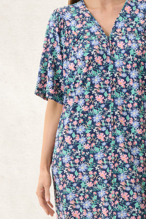 Short sleeve, zip front , short brunchcoat with a curved quilted yoke, the quilting extends over the shoulder and across the back yoke of the brunchcoat. Front and back gathers fall from both yokes. This fresh Royal floral slinky knit fabric has a silky finish enhancing the comfort and ease of movement. Wear by itself, or with one of our Tammy print nighties. The brunchcoat sits below the knee and has pockets in the side seams.