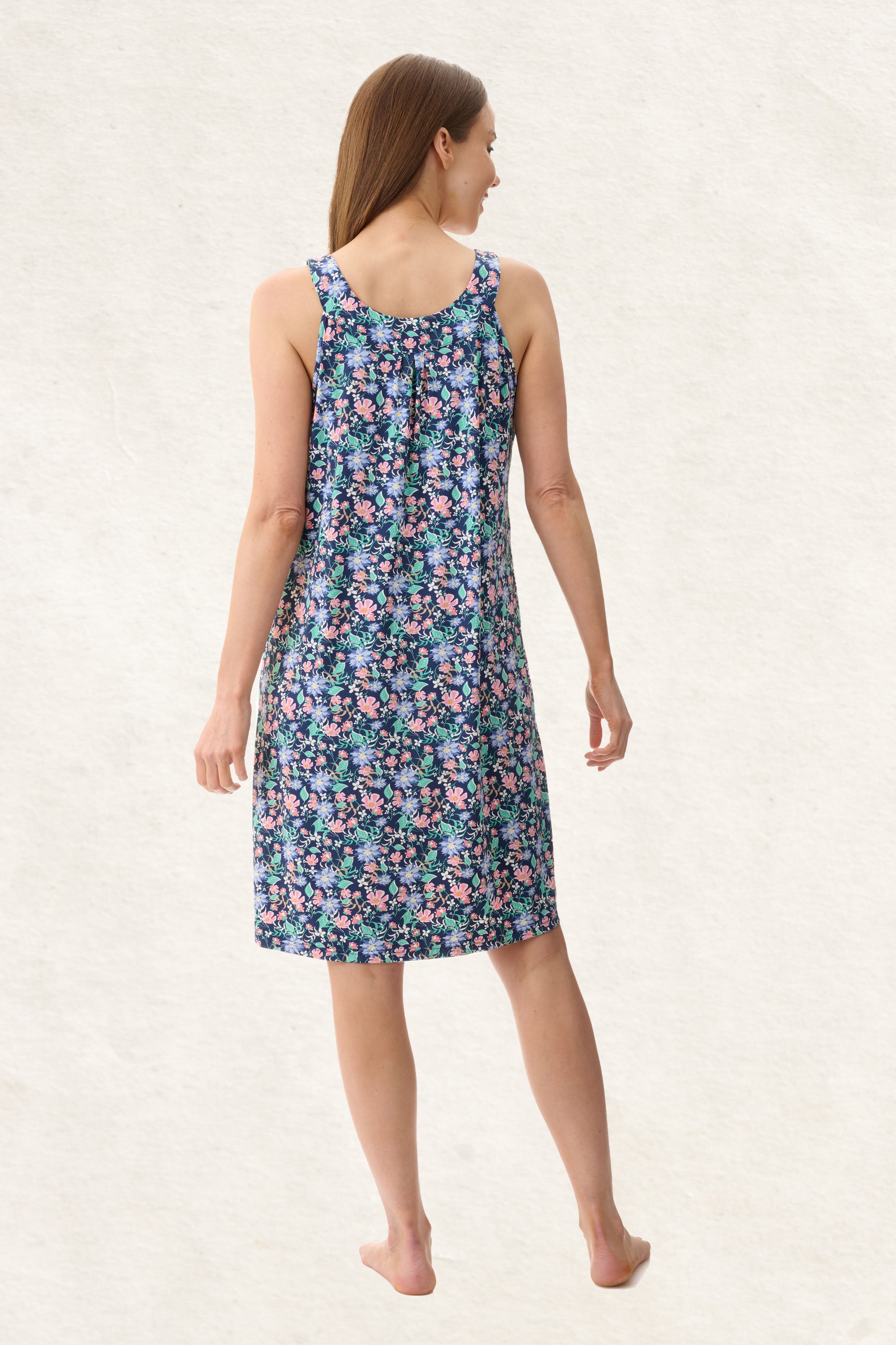 Sleeveless short nightie slinky knit in a gorgeous royal floral. This nightie features a shaped neckband , with centre pleats.  Tammy print short nightie sits just below the knee, the silky finish to the stretch fabric allows for ease of movement, and is cool to touch, a great choice for hot summer nights.