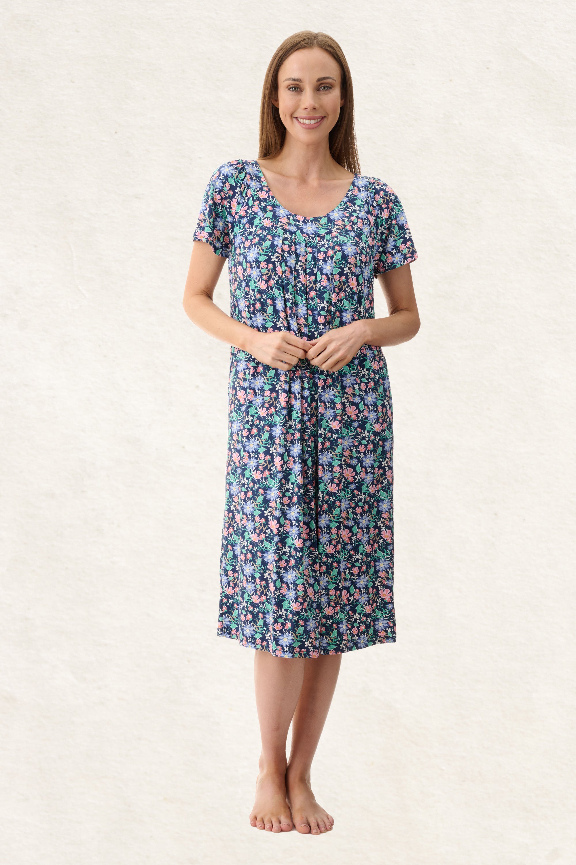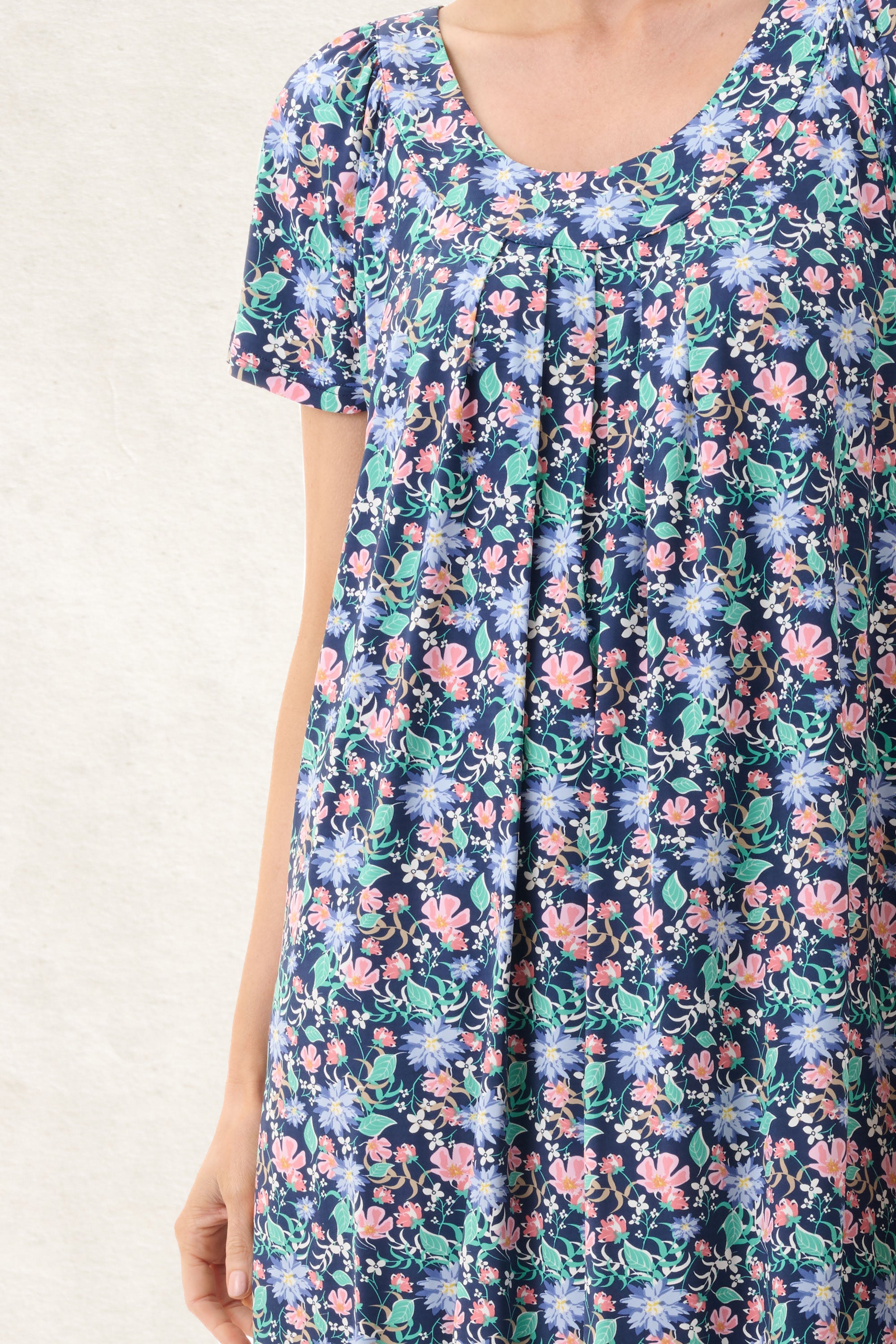 Cap sleeve short nightie slinky knit in a gorgeous royal floral. This nightie features a shaped neckband , with centre pleats. Tammy print short nightie sits just below the knee, the silky finish to the stretch fabric allows for ease of movement, and is cool to touch, a great choice for hot summer nights.