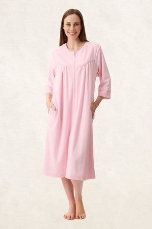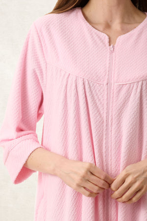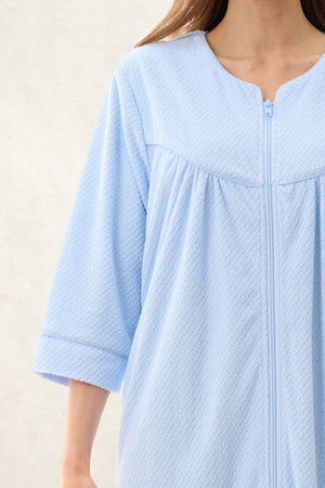 Wrap yourself in pure luxury with this self jacquard knit towelling zip gown. With 3/4 length sleeves, a zip front opening and a gathered yoke, this effortless design is the perfect summer weight gown. Pretty satin piping trim and side inset pockets