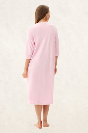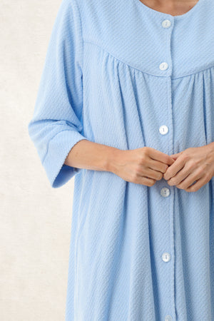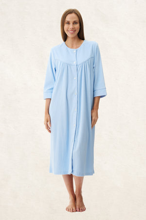 Wrap yourself in pure luxury with this self jacquard knit towelling gown.  With 3/4 length sleeves, a button front with yoke and gathers. this effortless design is the perfect summer weight gown. Pretty satin piping trim and side inset pockets.