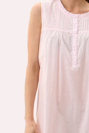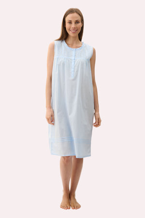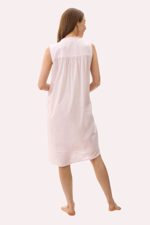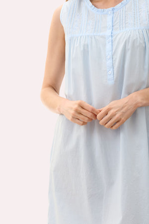 Experience the ultimate in comfort and style with our Sleeveless Short nightie. Gathered frill around neckline with straight yoke and embroided front with delicate pleats. Available in blue and pink