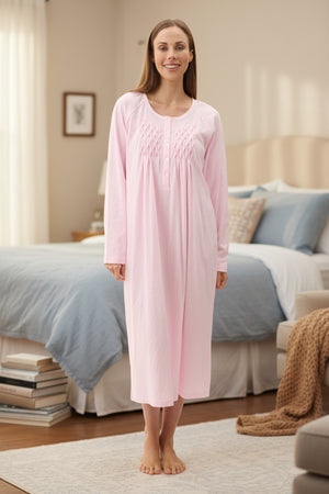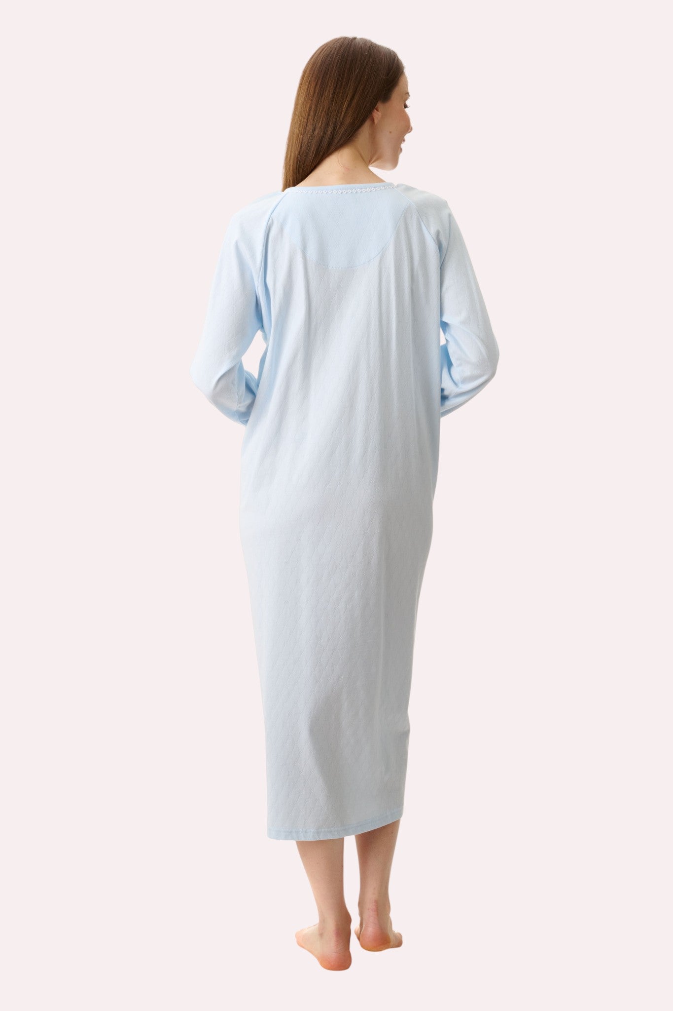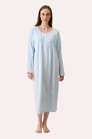 Mid Length Nightie in an elegant diamond jacquard knit. Front placket with buttons and lace trim detailing at the neck. Rounded yoke with criss cross pleat detail underneath with soft gathers in the body. Available in Blue and Pink.