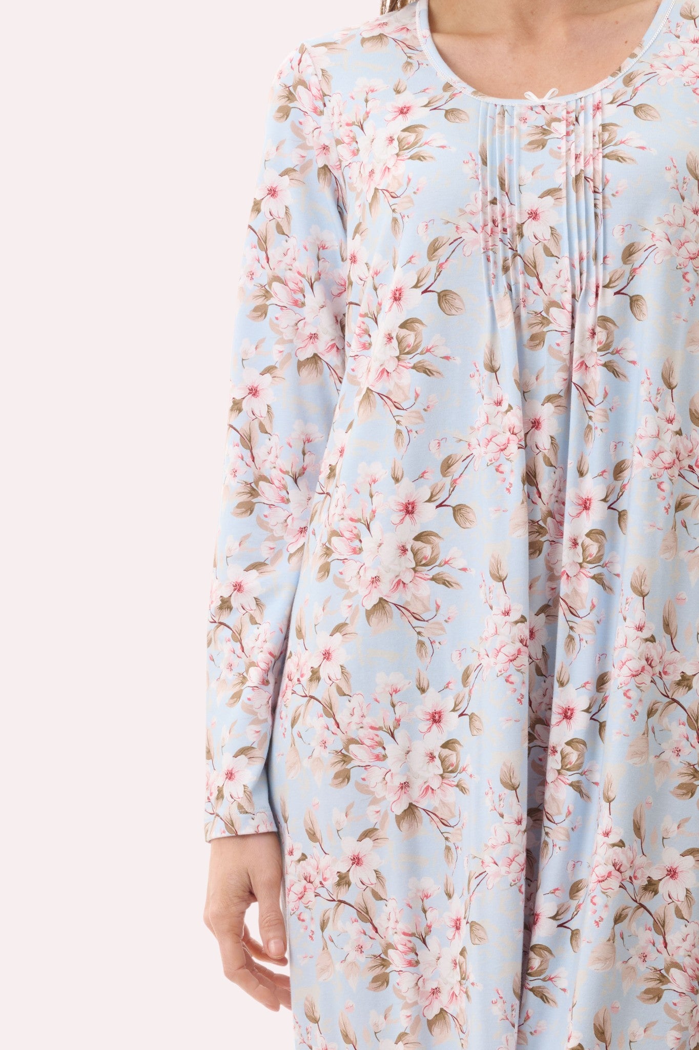 Short nightie with long sleeves in the dreamy soft blue Demi print with hints of sage and pink tones. Round neckline with pintucks and white scallop trim under the neck binding . Front pintucks either side of the sweet satin bow at centre front. Cotton Bamboo is soft, cool and comfortable to wear.