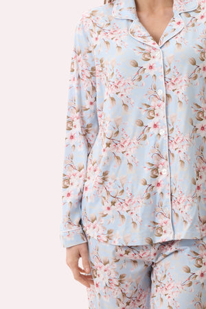 Long pyjama in the dreamy soft blue Demi print with hints of sage and pink tones. Long sleeves with full button opening, collar, cuffs, and shaped hemline. This beautiful soft knit pyjama has contrast white satin piping accents. The long pants have a comfortable elastic waist with a drawstring, and side pockets with satin piping. Cotton Bamboo is soft, cool and comfortable to wear.