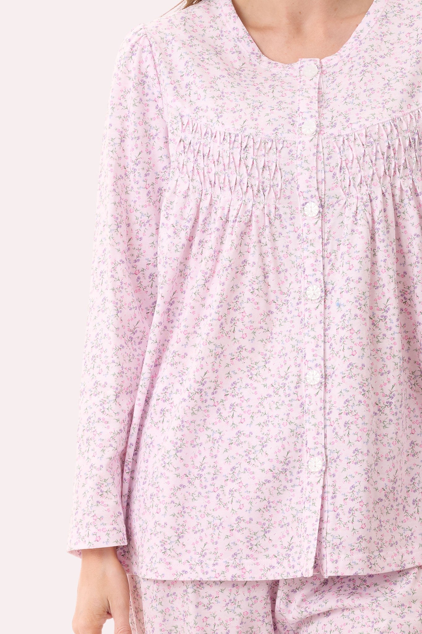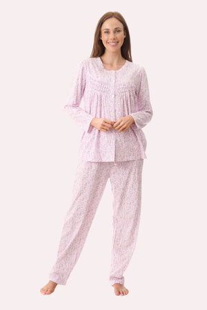 Faith Long pyjama in in our "Thea" soft pink sweet floral printed jersey. Shaped yoke with crisscross pintuck detail underneath, either side of the front button placket. Round neckline with self binding . Long pant with elastic waist and drawstring tie.