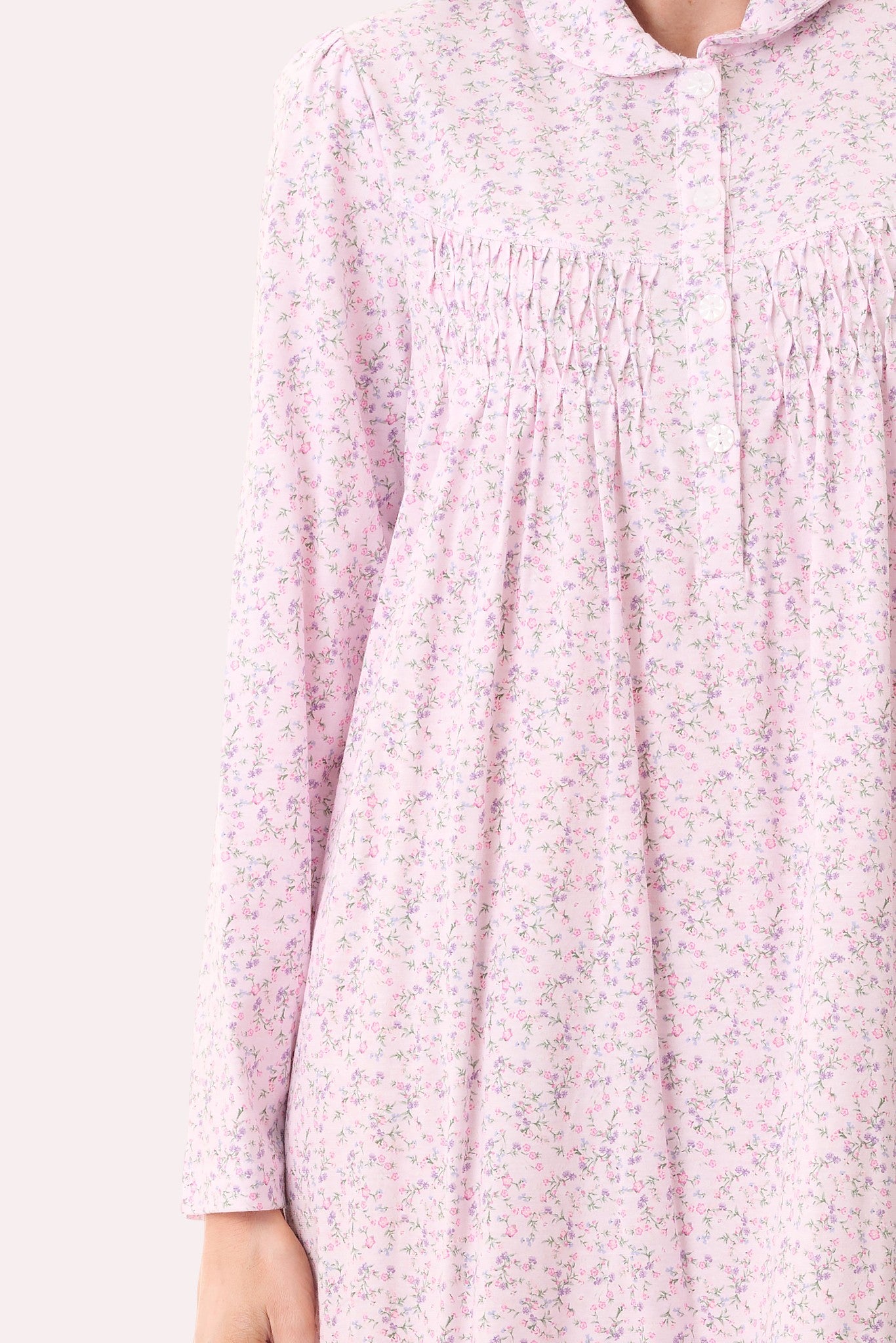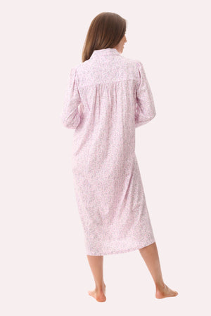 Mid length nightie in our "Thea" soft pink sweet floral printed jersey. Shaped yoke with crisscross pintuck detail underneath, either side of the front button placket. Collar with self piping trim. Back yoke with soft gathers.