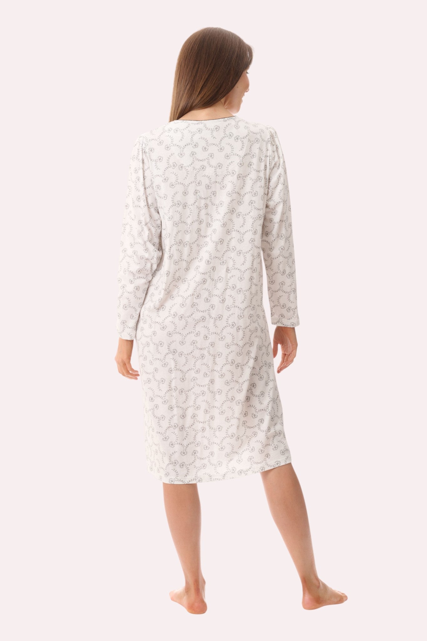Short nightie in an elegant black and ivory print "Nadia" on a comfortable knit jersey. This nightie has long sleeves with round neckline and criss cross pintuck feature at front yoke. Button placket at front and a pretty black picoette around neckline to compliment the look.