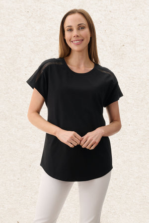 Crafted from 100% soft cotton, this top combines effortless comfort with a touch of sophistication. The delicate lace inserts at the shoulders add a feminine, elevated detail, while the extended sleeves offer a relaxed, modern fit.
