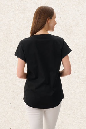 With a classic crew neck and a curved hem that flatters the silhouette, this top is perfect for layering or wearing on its own. Versatile and chic, it pairs effortlessly with jeans, skirts, or trousers for a casual yet polished look.