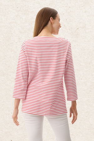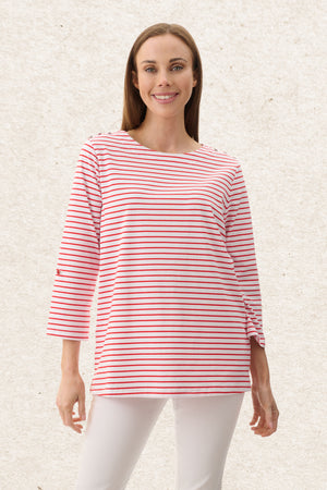 The classic crew neck and 3/4 length sleeves with tab details add effortless sophistication, while the buttons at the shoulder give this top a stylish, unique finish. Perfect for layering or wearing solo, this top brings versatile charm to any wardrobe.