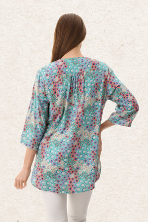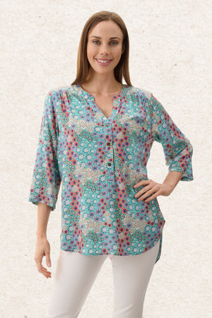 Made from 100% rayon, this shirt offers a lightweight, breathable feel with a beautifully fluid drape. The flattering V-neck features a half placket with buttons, combining classic style with easy wearability.