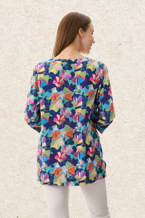 The button detail at the neck adds a subtle focal point, while the curved hem creates a flattering, feminine silhouette. Perfect for casual days or dressed-up occasions, this top blends comfort and chic with ease.