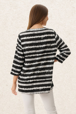 The button detail at the neck adds a subtle focal point, while the curved hem creates a flattering, feminine silhouette. Perfect for casual days or dressed-up occasions, this top blends comfort and chic with ease.