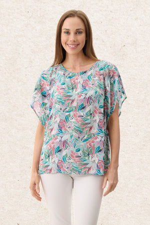 This printed kimono sleeve top features an eye-catching all-over print on soft, breathable 100% rayon fabric. The relaxed kimono sleeves and classic crew neck offer a comfortable, stylish fit, while subtle seaming details add refined structure—perfect for effortless, statement-making style.