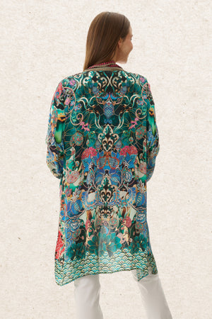 This open kaftan features flowing kimono sleeves and a striking designer border print, crafted from soft, lightweight viscose silk-feel crepe for a smooth, elegant drape. The mid length adds versatility—perfect for layering over swimwear, slips, or your favourite summer outfit.