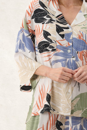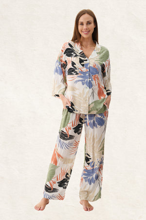 Indulge in ultimate comfort with our relaxed-fit pyjama set in soft woven twill, adorned with a striking hand-illustrated tropical leaf print. Featuring an ankle length pant and 3/4 sleeve, the soft woven twill fabric ensures a relaxed and unrestricted fit, for a tranquil night's sleep. The eye-catching tropical leaf print adds a touch of tropical charm, combining comfort and style seamlessly.
