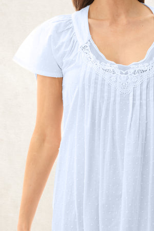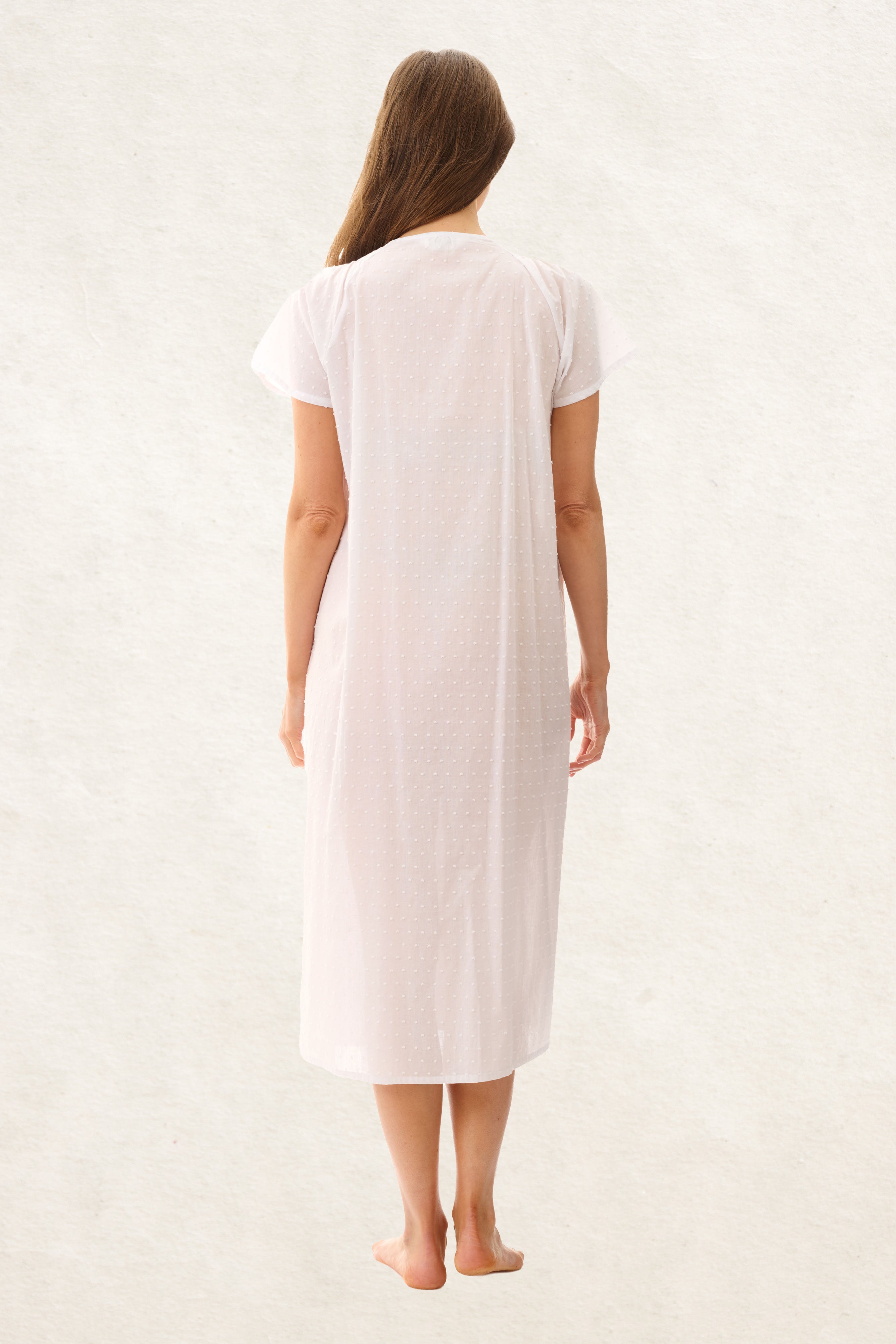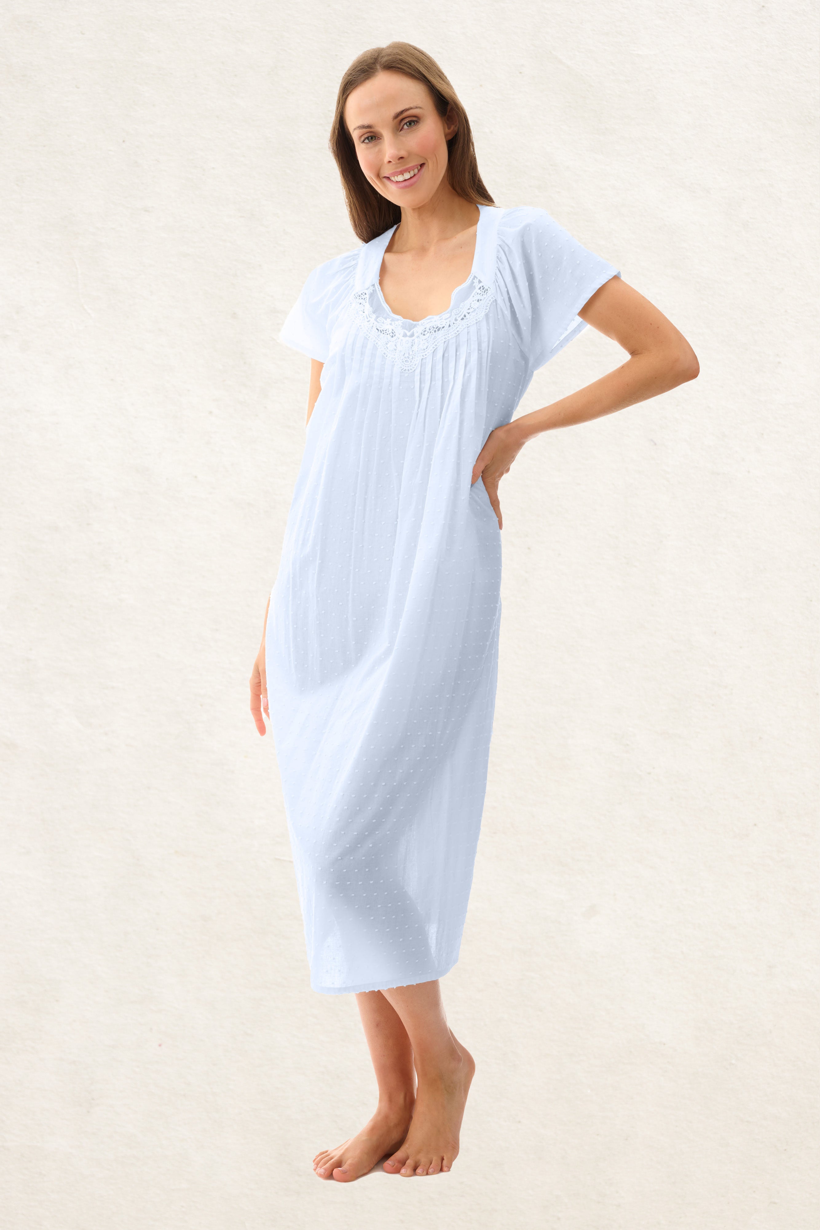 Mid length nightie with cap sleeves and elegant lace motif at neckline. 100% woven spot dobby cotton is a summer weight fabric keeping you cool and elegantly comfortable.